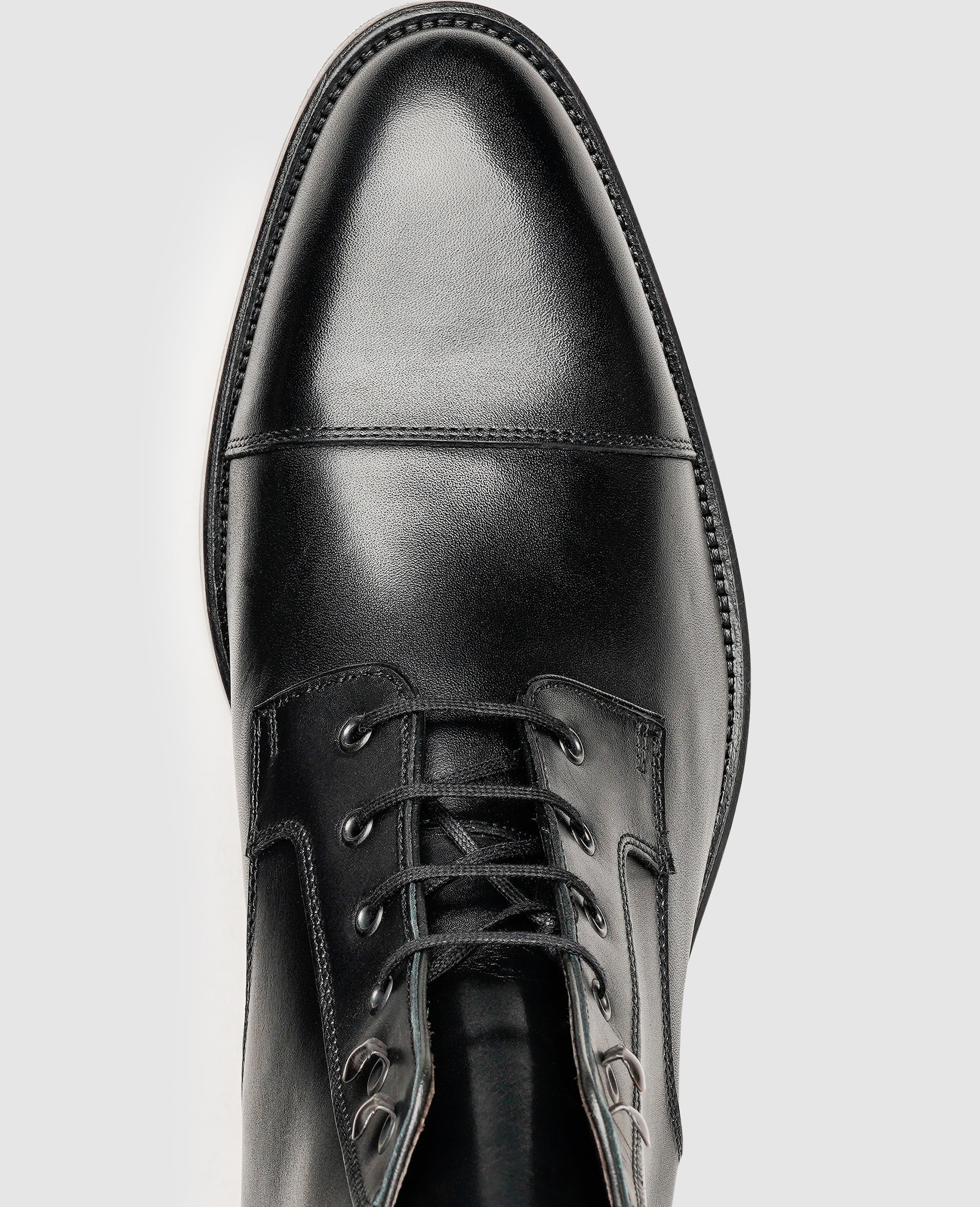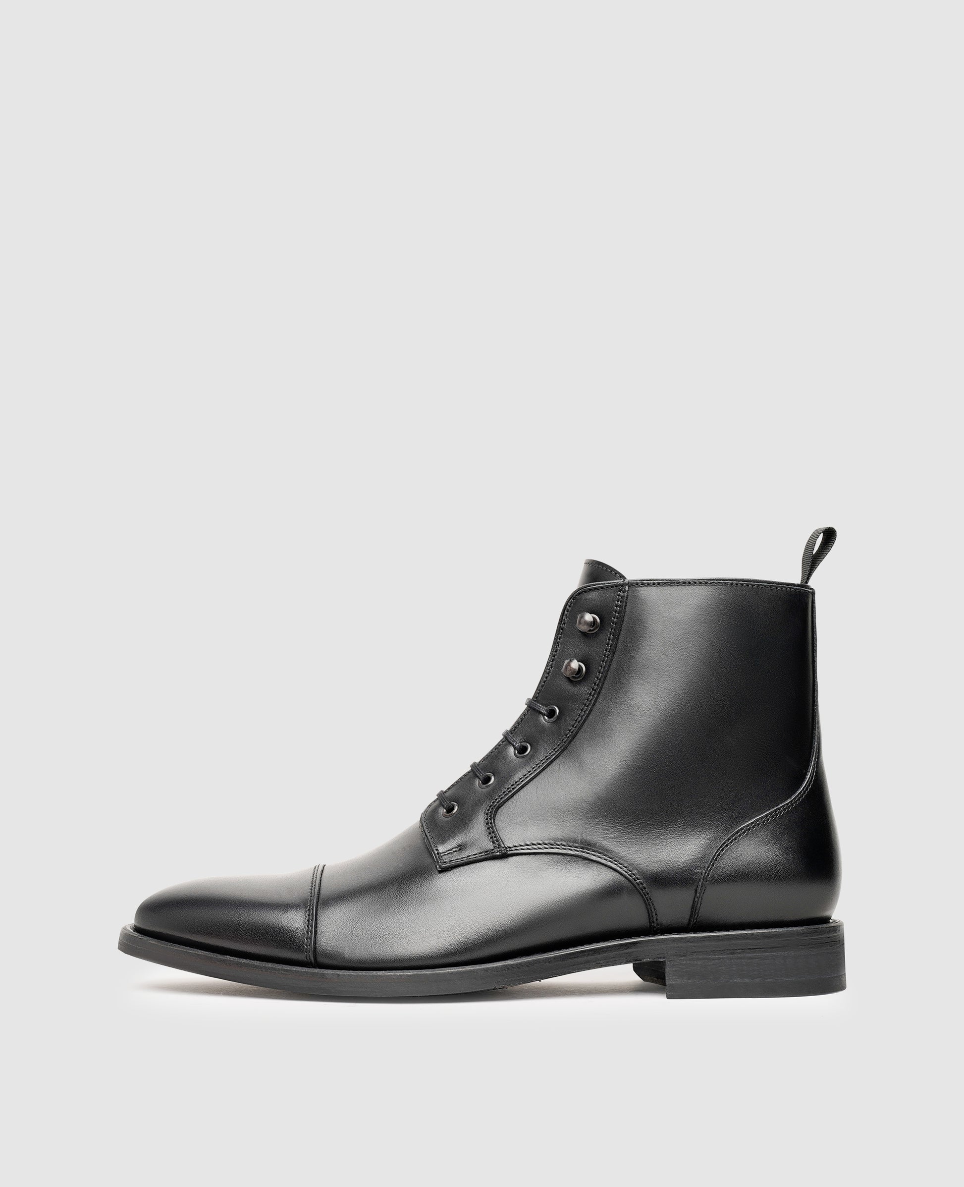 Timeless elegance is the hallmark of these Blake-stitched, cap-toe Derby lace-up boots for men from Henry Stevens. The lightweight construction, integrated heel cushion with memory foam effect and non-slip leather-rubber outsole create a comfortable walking experience with a high degree of flexibility. Their charming appearance is due in no small part to the fine smooth calfskin leather used, while the inner lining is made of compostable organic material for comfort.