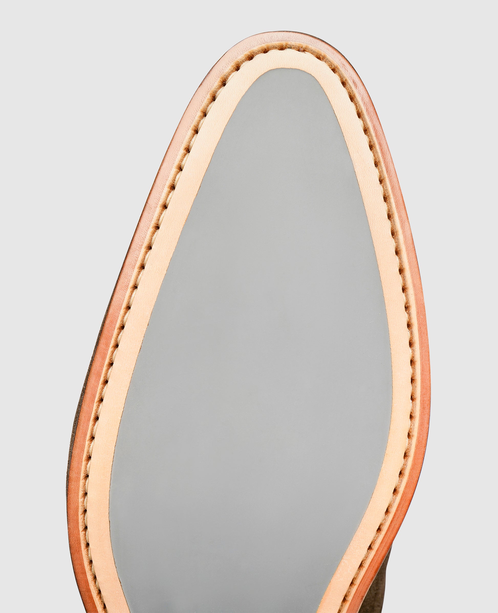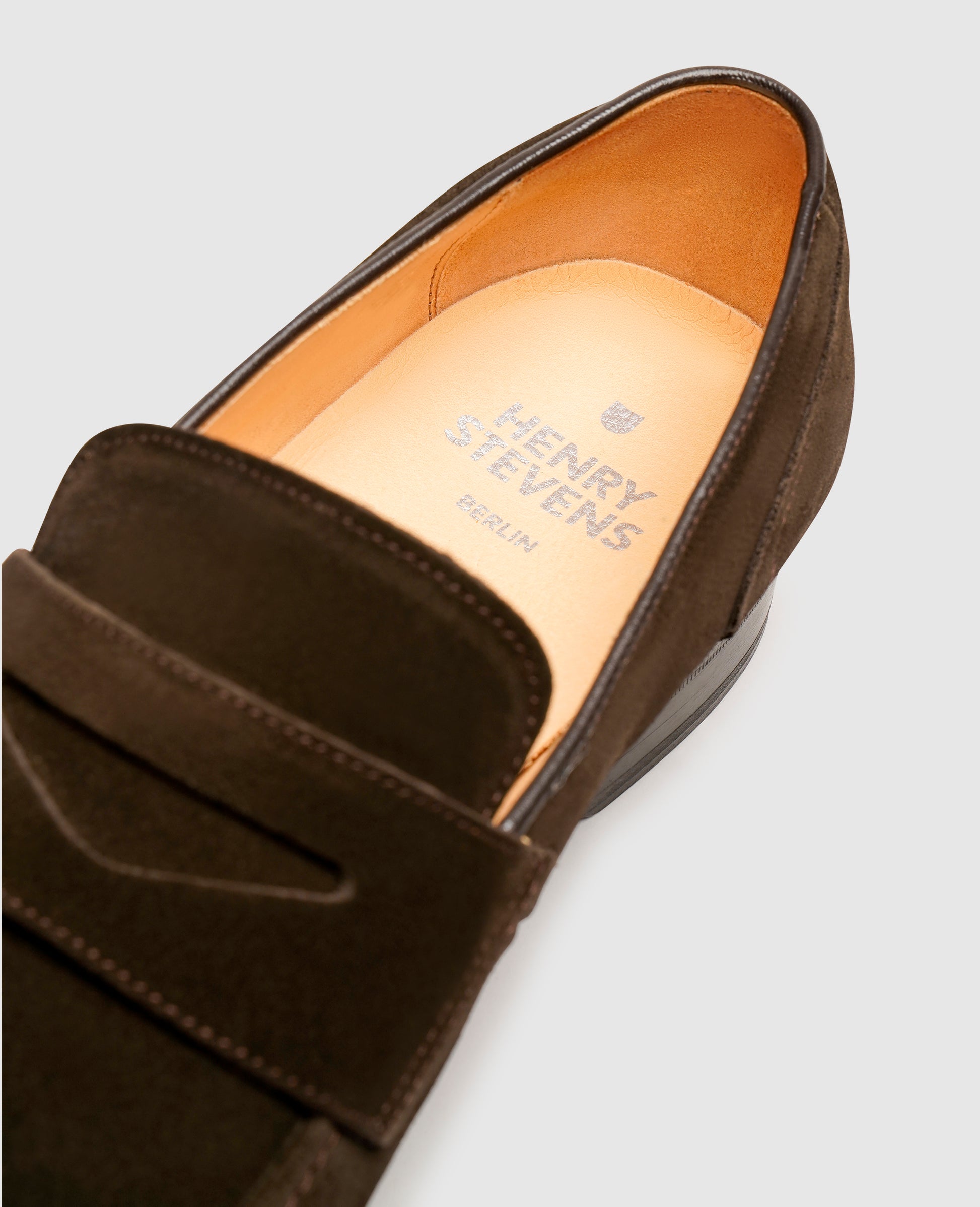 A timeless look, exquisite materials, and attention to detail transform this Blake-stitched Penny Loafer from Henry Stevens into an excellent match for mild to summery temperatures. The famous slip-on shoe for men is offered here in a velvety suede leather together with a combined leather outsole with rubber insert. Inside this model features a breathable organic leather lining and an integrated heel cushion with memory foam effect.
