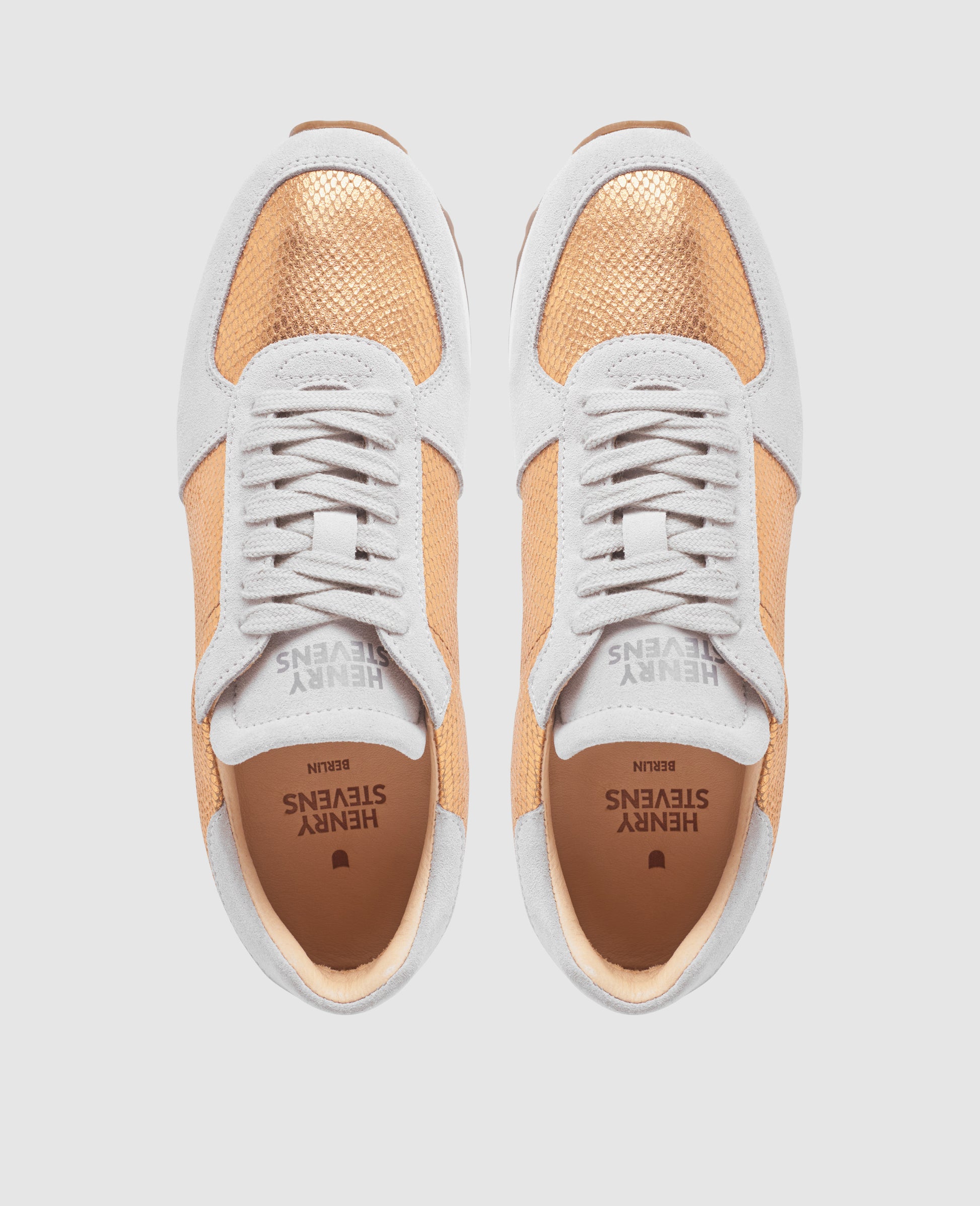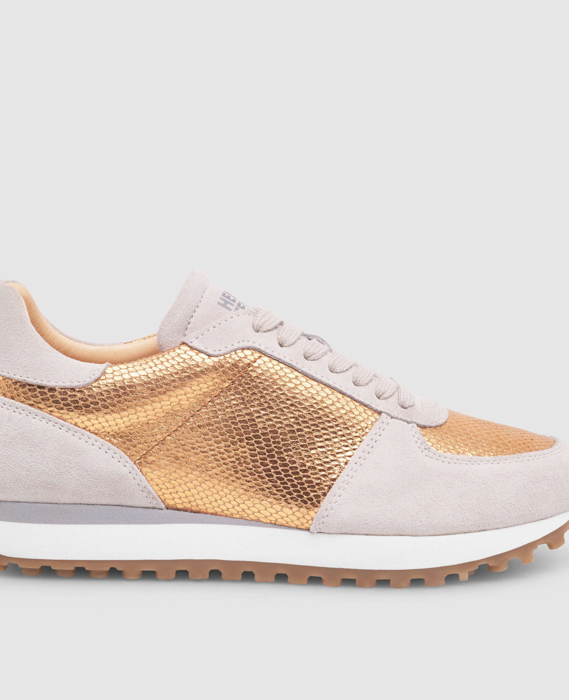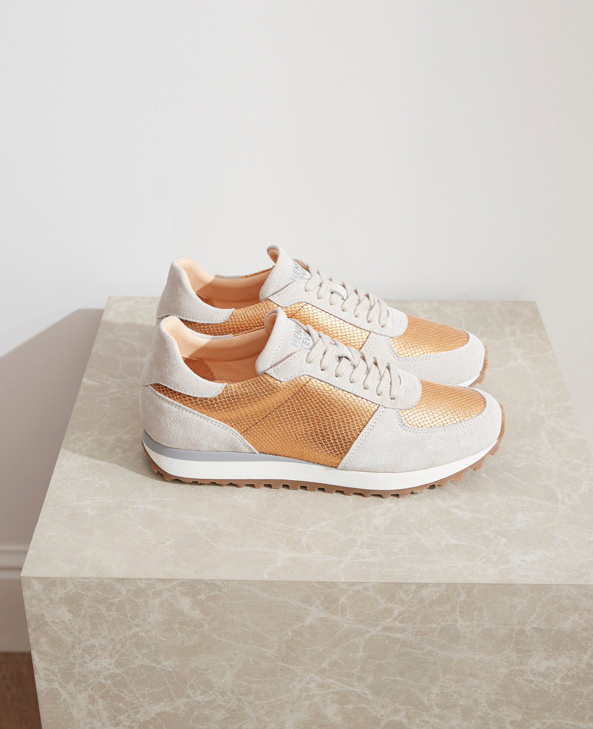 A harmonious interplay of calf suede and calfskin with elegant snake embossing, lined with sustainable organic leather. The copper is reminiscent of light summer days - a shoe that effortlessly combines modern design and summery elegance.