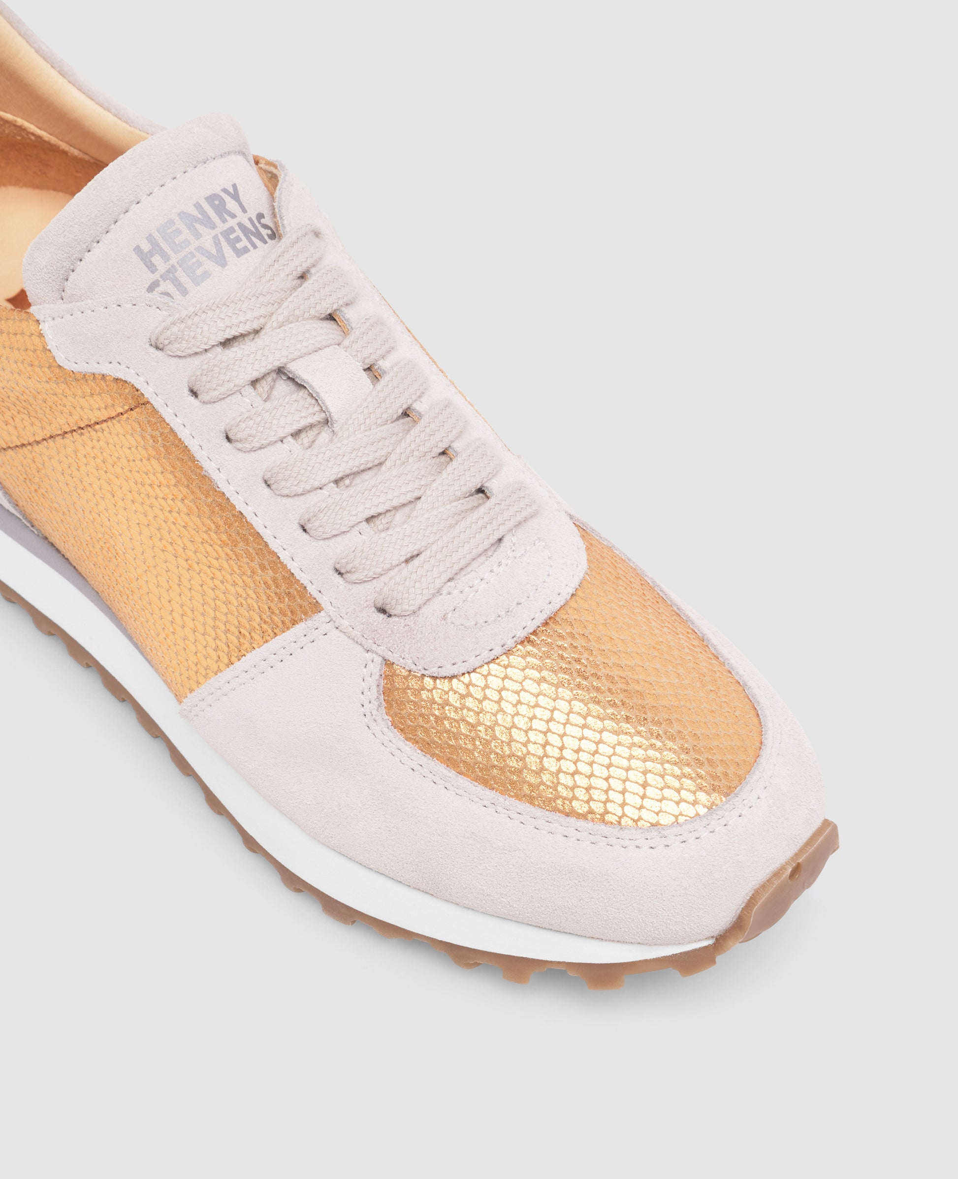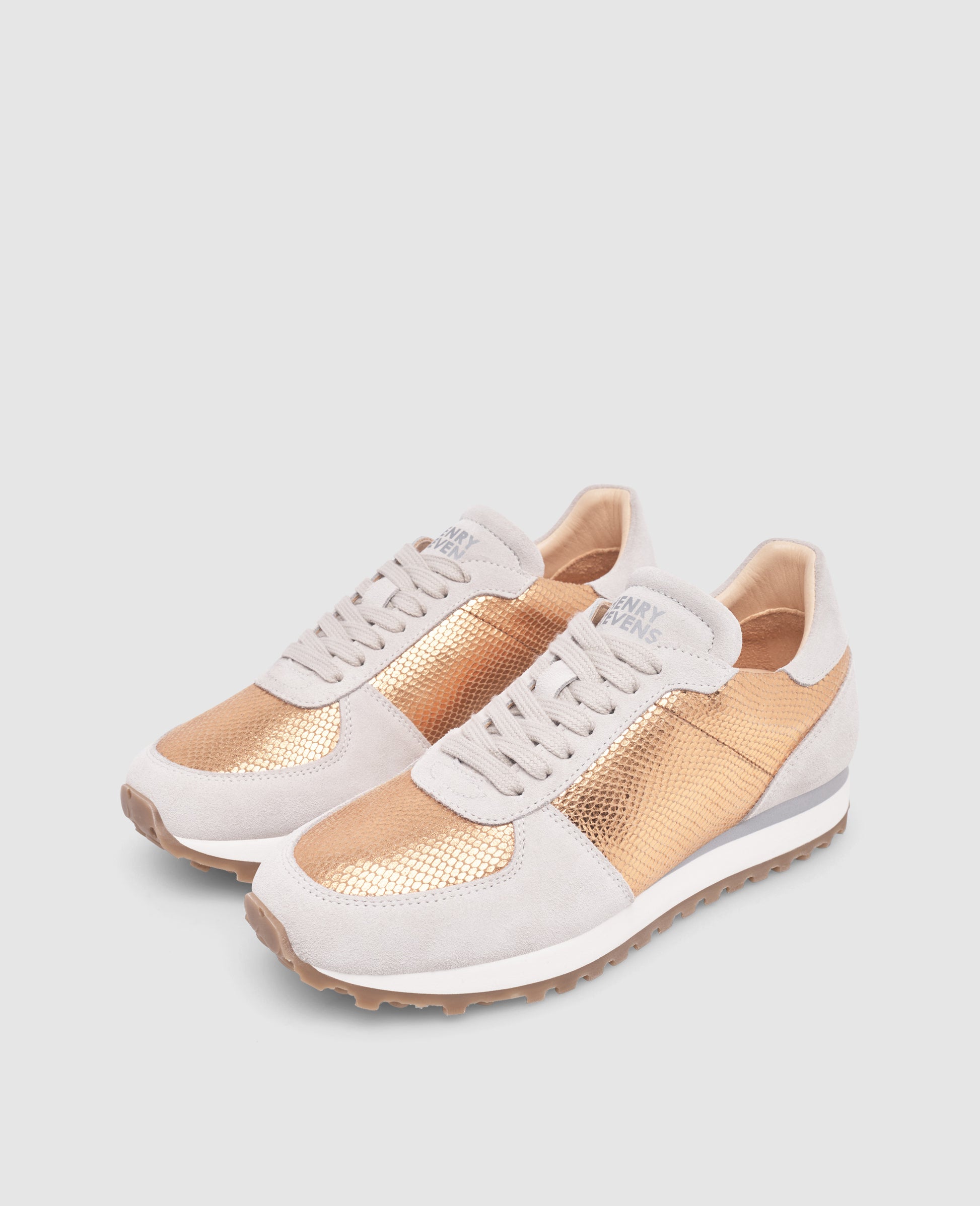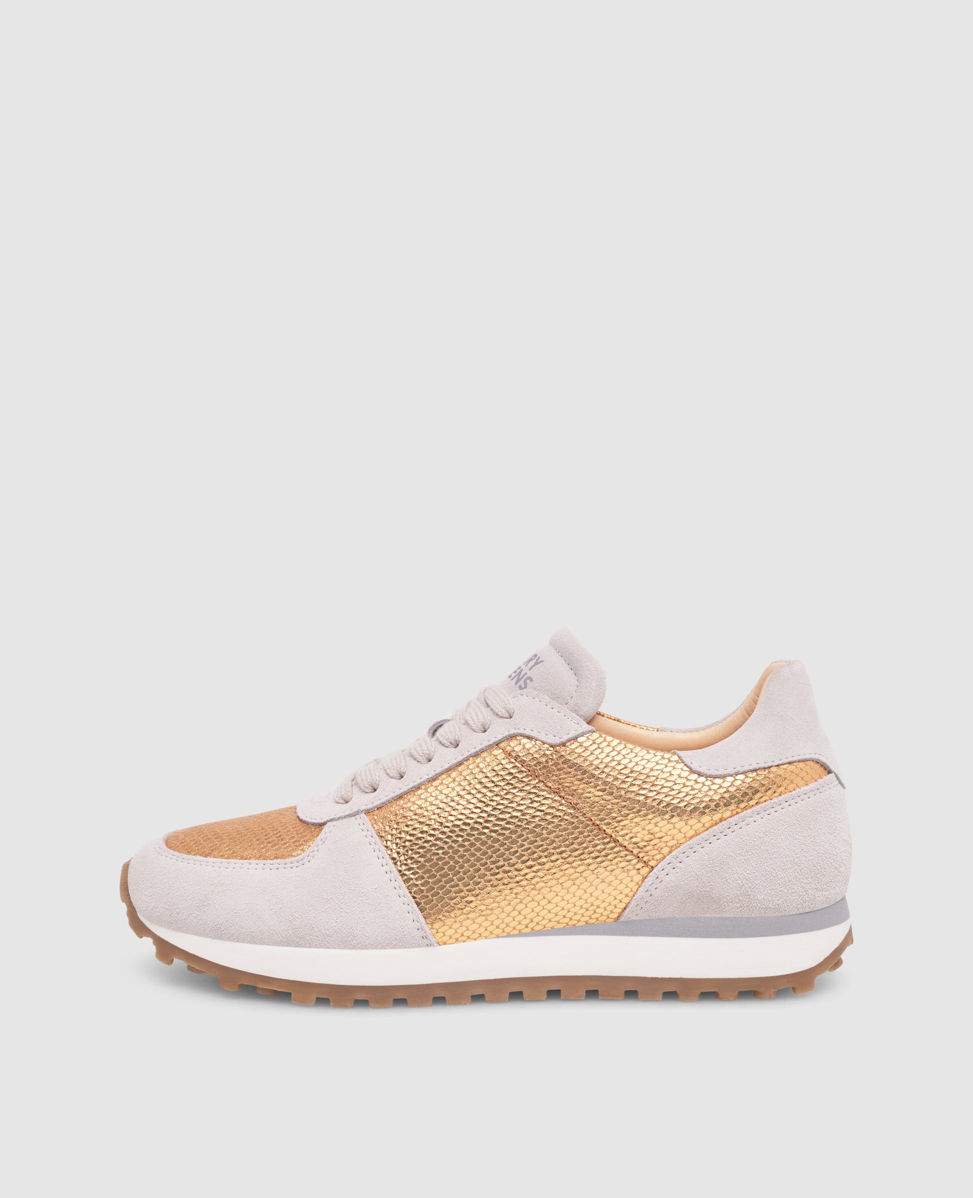 A harmonious interplay of calf suede and calfskin with elegant snake embossing, lined with sustainable organic leather. The copper is reminiscent of light summer days - a shoe that effortlessly combines modern design and summery elegance.