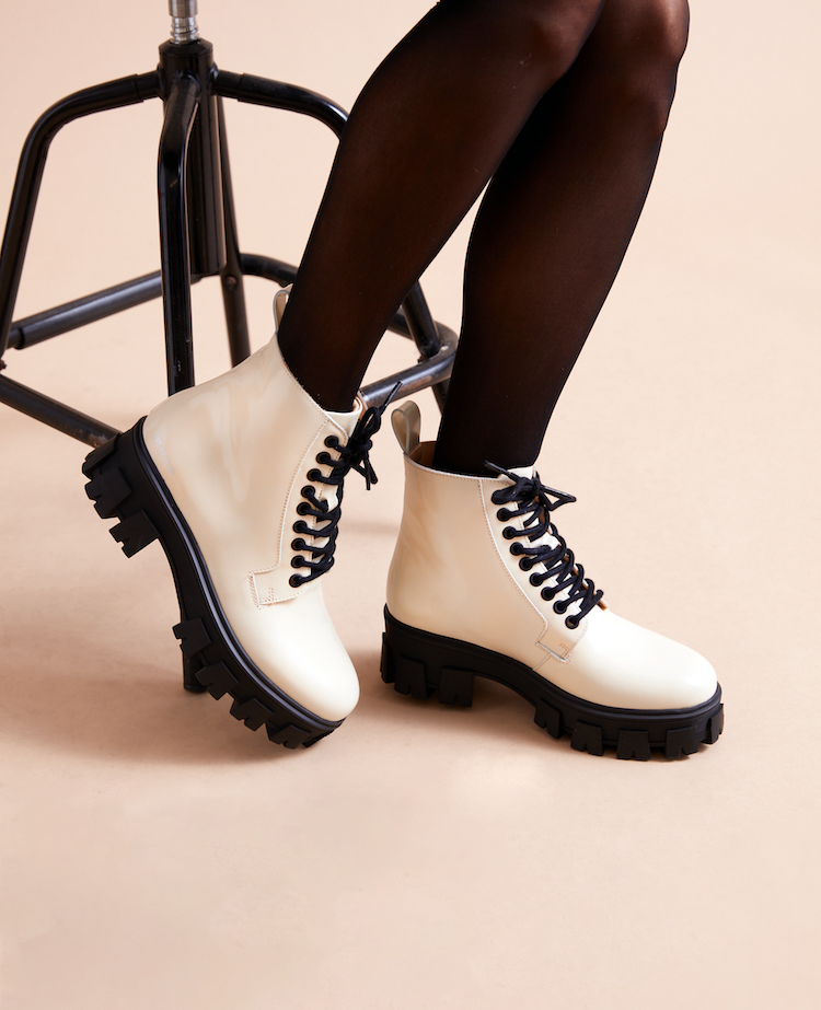 These extravagant lace-up ankle boots exude urban flair from the very first glance. The combination of the striking rubber sole with its forefoot platform, the smooth leather of the upper, and the eye-catching lacing makes this women's shoe model a real statement piece. Special detailing also awaits the wearer on the inside, as the model is lined with a compostable organic leather - completely free from harmful substances.