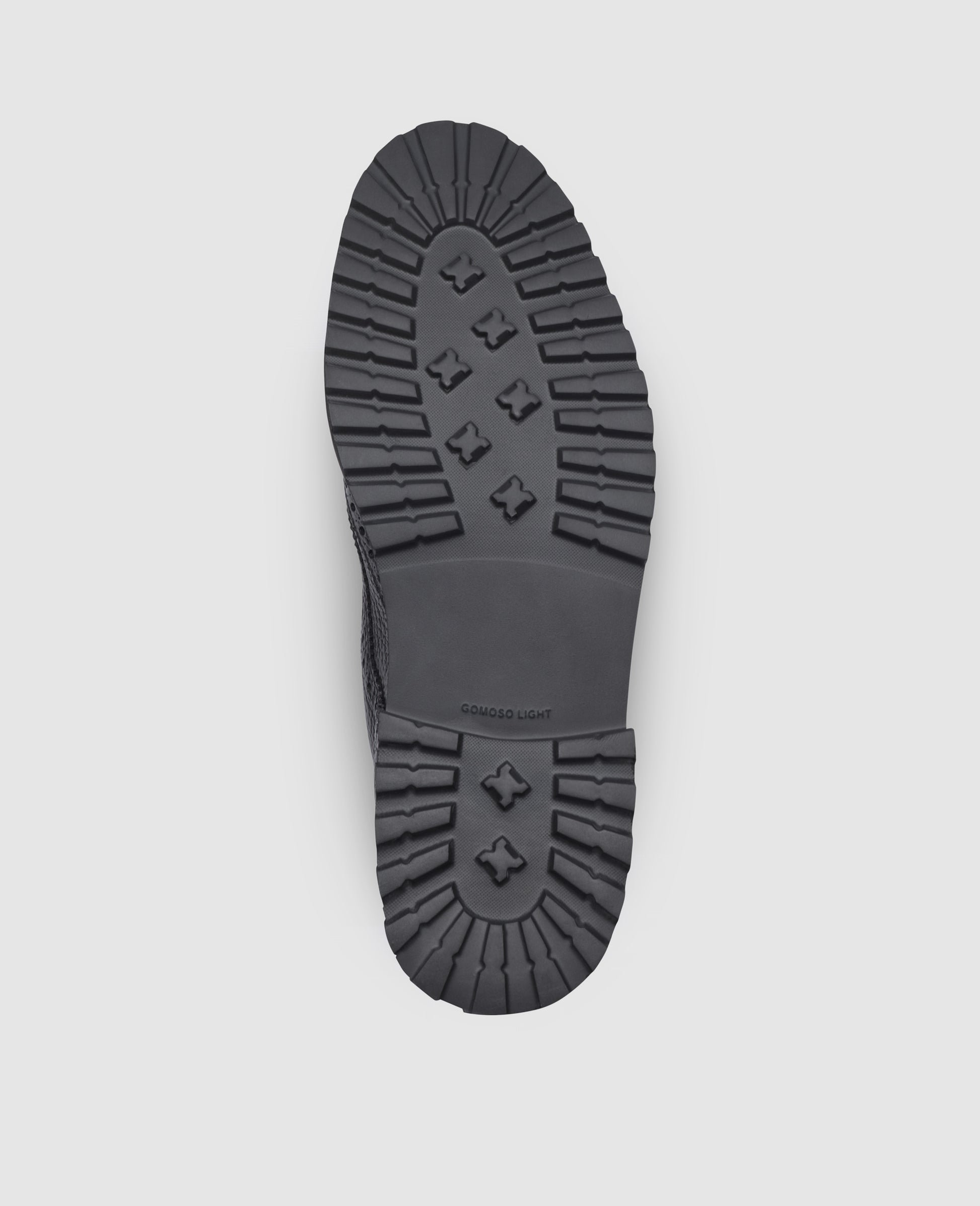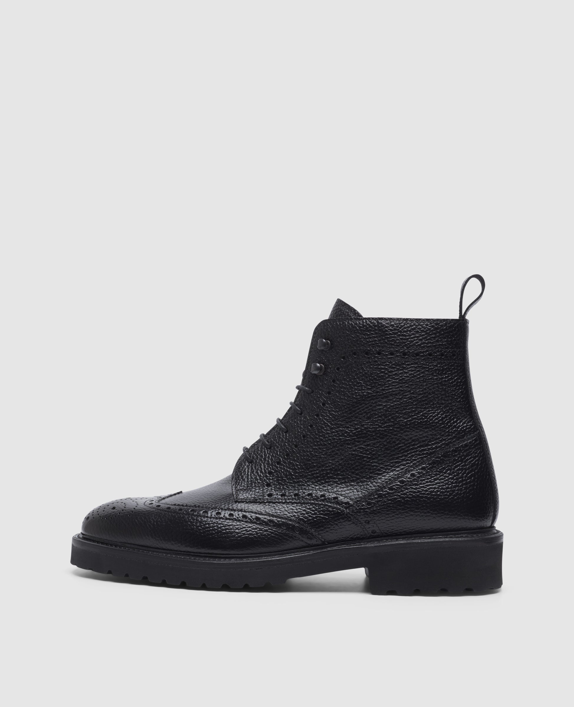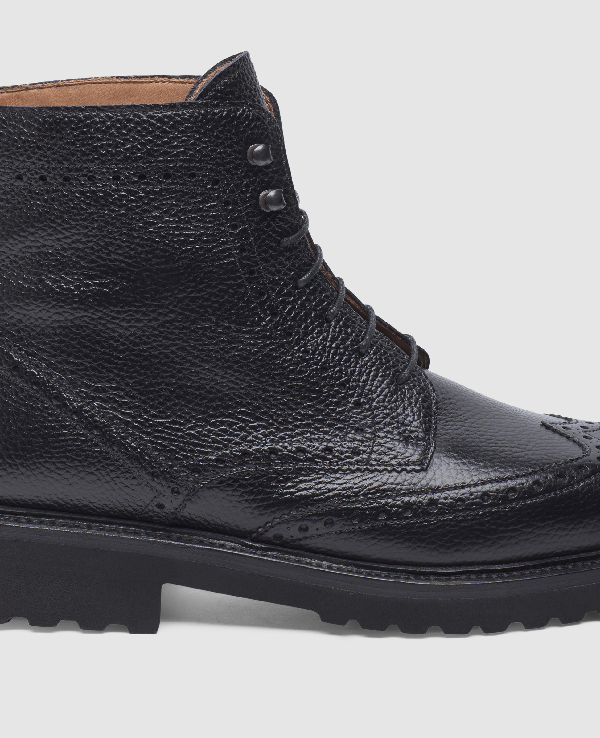 The handmade Winston full-brogue derby boot in black is made from embossed calfskin and an interior made from vegetable-tanned leather. Thanks to its goodyear-welted design and ultra-light rubber sole, it offers maximum comfort. Made in Spain.