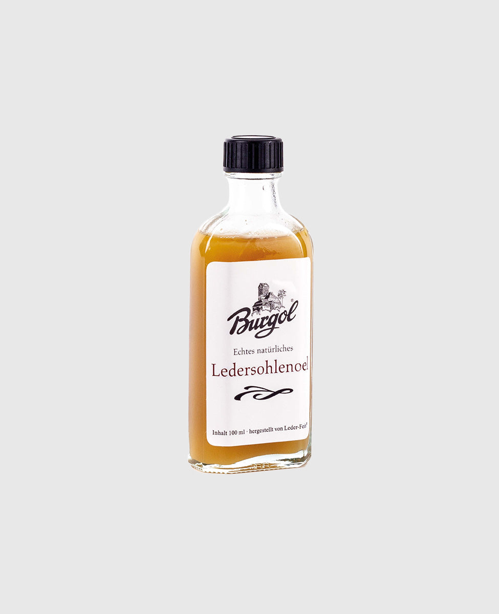 Burgol Leather Sole Protector doubles the life of the sole. Leather soles of shoes are exposed to moisture, wetness and, in winter, road salt and grit and can quickly become brittle. Burgol's leather sole oil helps to prevent premature wear. It saturates the leather, reduces abrasion and leads to greater water repellency, while the leather of the outsole does not receive any fatliquoring agents to increase its softness during leather production. And why? The sole should remain extremely resistant. But leather is a natural material and needs to be nourished - leather soles are no different. Burgol leather sole oil is made exclusively from natural oils and fats that are based on the pH value of vegetable-tanned leather outsoles.Burgol leather sole oil doubles the life of the leather soleIn addition to increasing the hydrophobicity of the outsole leather, the leather sole oil above all maintains the bending elasticity of the shoe bottom. At the same time, the important cross-linking of the tanning agent with the leather fibres is retained with this high-quality leather sole oil. Friction and wear of the sole is also minimised to half of the original value by the oil molecules binding to the collagen fibres. Using Burgol leather sole oil doubles the life of the leather sole. This has been confirmed by an expert report from the German Leather Institute. An ordinary leather oil is usually designed for chrome leather and is therefore completely unsuitable for a leather sole, as it shifts the pH value of the sole, which loosens the tanning agents and reduces the service life of the leather sole. Many oils are also not stable in the long term. They break down acids and thus wear down the leather. The long-term stability of Burgol leather sole oil is guaranteed by the required saponification and iodine content. Leather sole oil is easy to useThe application of leather sole oil is very simple, but there are a few important points to bear in mind: Before applying leather sole oil for the first time, the leather sole should be broken in a little. It roughens and thickens. Six weeks is a good guideline. The leather sole oil is then best applied to the compacted and roughened leather sole with a brush until it is saturated. The direct sole edge area should be avoided in order to prevent staining of the upper leather. The treated shoes are then best left to dry lying on their sides on a plastic bag. After a further six months or so, treat the soles again with the leather sole oil and do not use leather sole oil on glued soles. Burgol leather sole oil should not be used on glued soles, as the oil could damage the glued joints, nor should the leather sole oil be applied to the upper leather of the shoes or clothing, as these stains can no longer be removed.